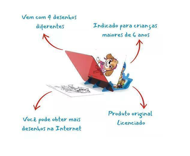 Um kit completo para te ensinar a desenhar, vem com peças plásticas para montar a base, lápis e papel. Você encaixa a cartela ou celular com a imagem dos personagens da Patrulha Canina, e pelo reflexo desenha no papel.